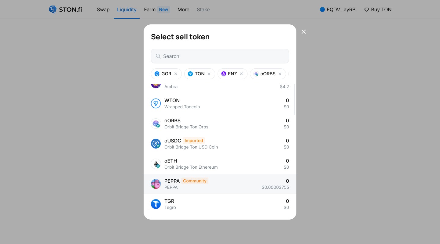 5. Нажмите кнопку "Transfer TON" (TON и PEPPA в данном случае являются примерами, инструкция применима к любым токенам)для перевода небольшой суммы первого актива, после чего подтвердите транзакцию в кошельке. Внимание: эта сумма требуется для инициализации пула и не будет возвращена!