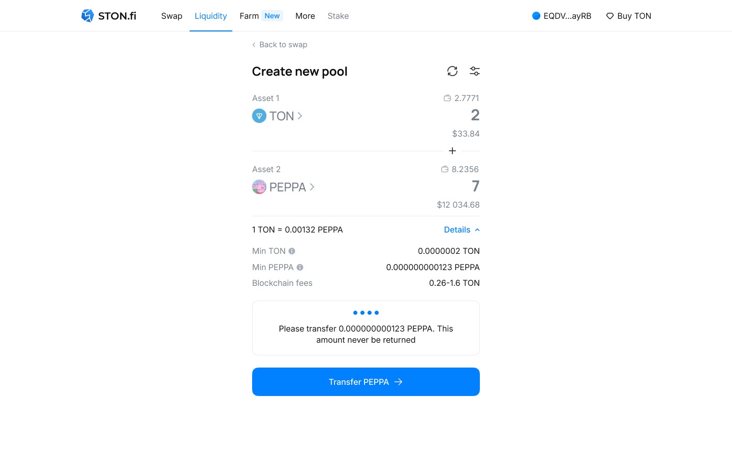 6. Нажмите кнопку "Transfer PEPPA" (TON и PEPPA в данном случае являются примерами, инструкция применима к любым токенам)для перевода небольшой суммы второго актива, после чего подтвердите транзакцию в кошельке. Внимание: эта сумма требуется для инициализации пула и не будет возвращена!