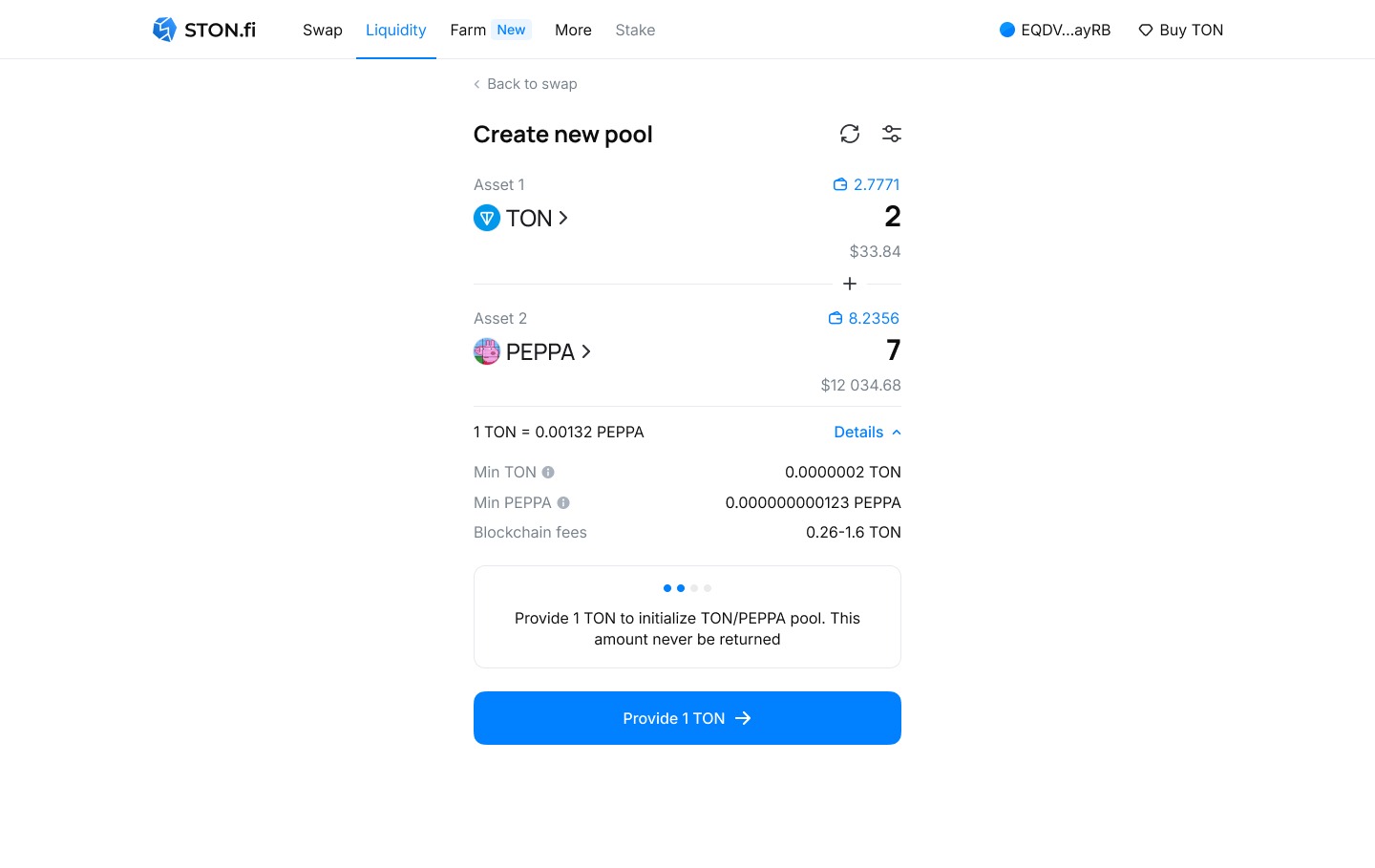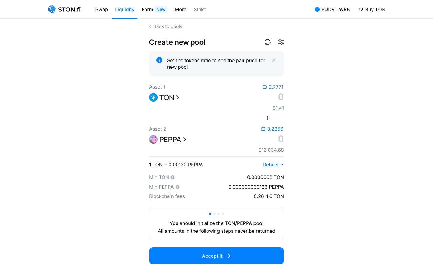 4. 1. Введите соотношение активов, которое и определит стартовую цену в пуле. Соотношение может быть задано любыми удобными числами (1/10 = 0,1/1 = 10/100 и т.п.). Обратите внимание, что списаны с кошелька будут не те суммы, которые вы вводите, а значения, указанные как "min TON" и "min PEPPA". Эти суммы должны быть на кошельке и являются минимально возможными для создания пула ликвидности!